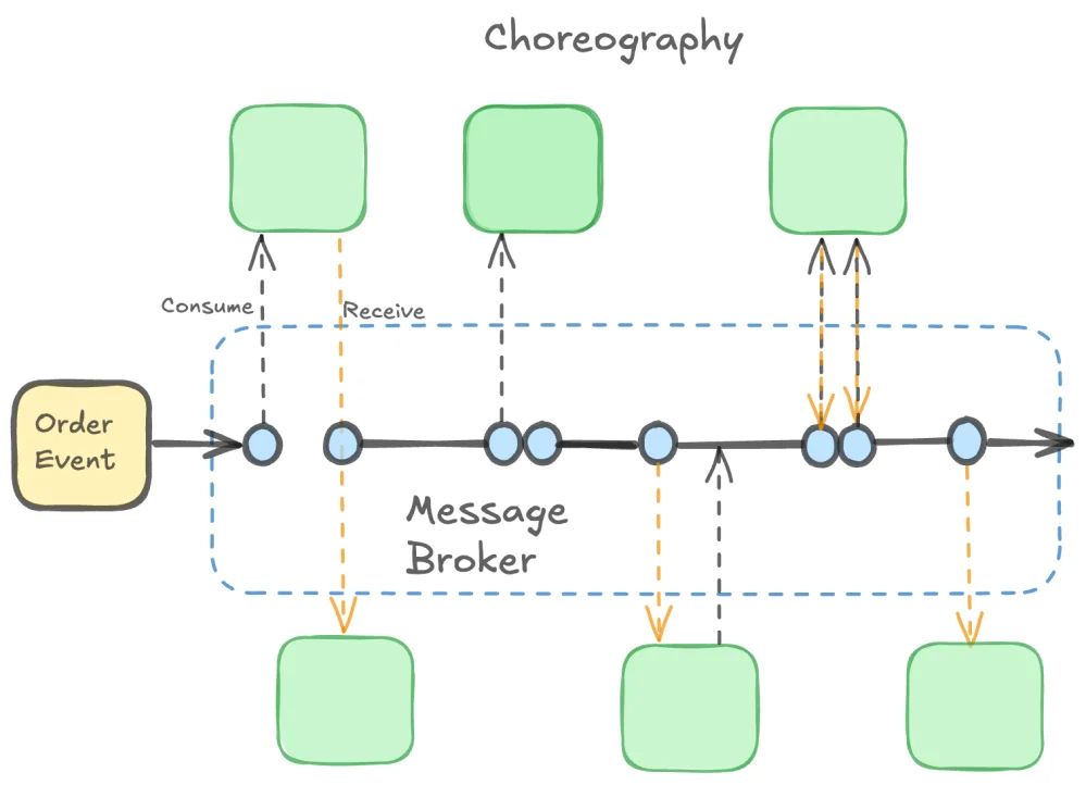 - Choreography, on the other hand, is a decentralized approach where each microservice independently interacts with other microservice based on predefined rules or events.