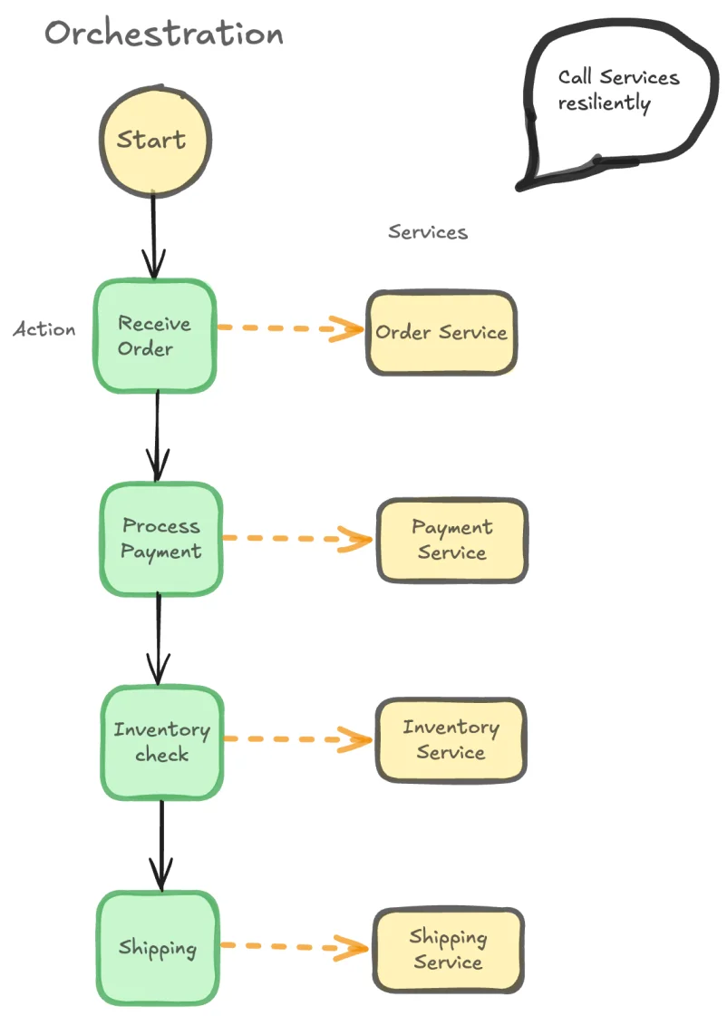 - Orchestration is a centralized approach, and the orchestration platform automatically coordinates the workflows by handling service-to-service communication, retrying failed tasks, and ensuring each service operates in the correct sequence.