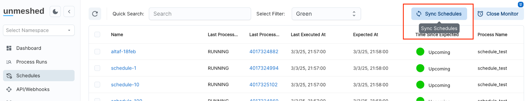 This will re-sync all the enabled schedules with the execution engine and will attempt to run them at the next schedule. If it doesn’t run even after a sync, please reach out to the support team to check the logs for symptoms.